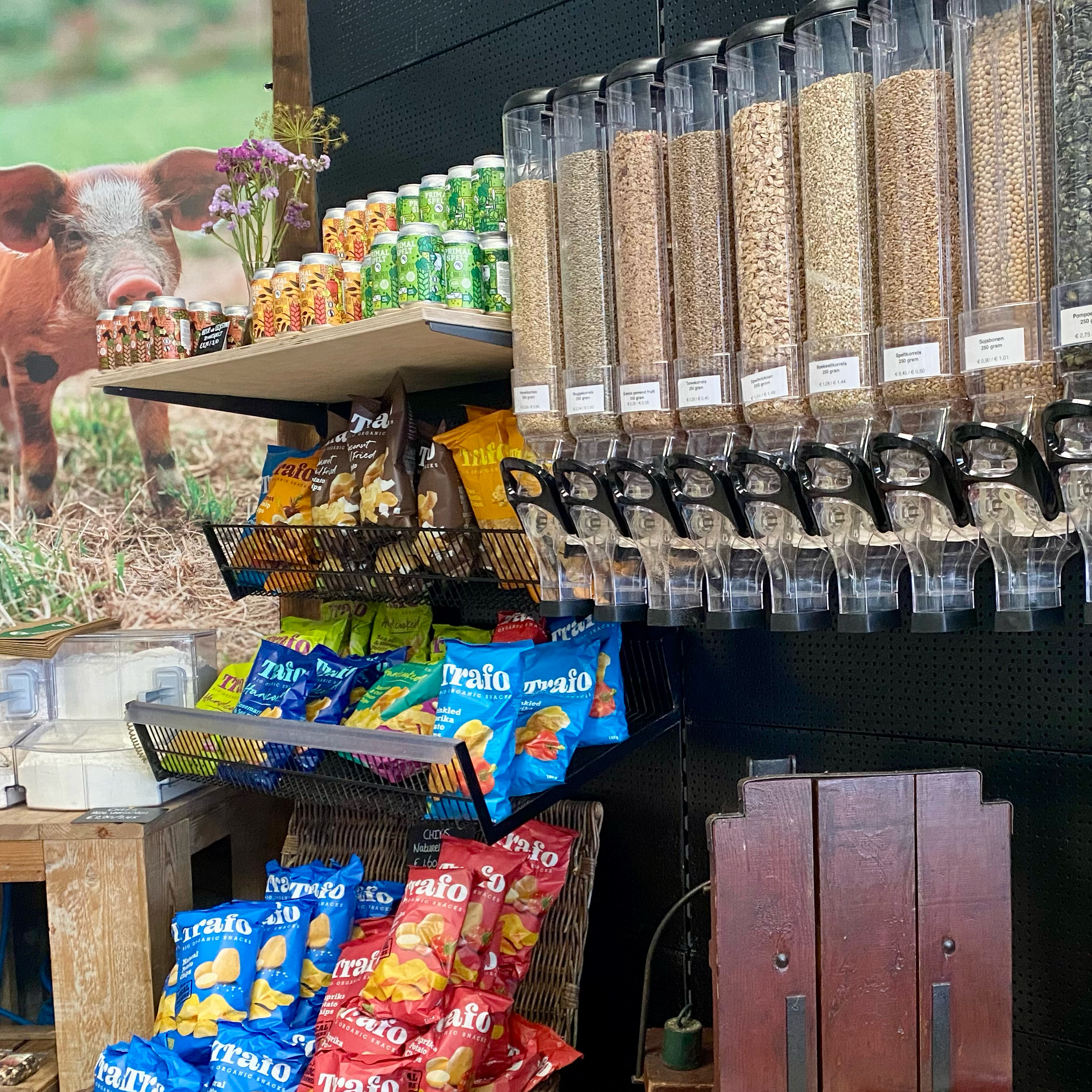 - Onze boerderijwinkel beleefde een hernieuwde opening in verband met een aangepaste indeling, talloze nieuwe producten en een nieuwe bulk dispenser wand. Dus neem voortaan je eigen bakje mee van thuis en kom daar producten als granen en zaden zelf in ’tanken’. Leuk, leerzaam en duurzaam; want we gooien zo samen minder verpakkingen weg!